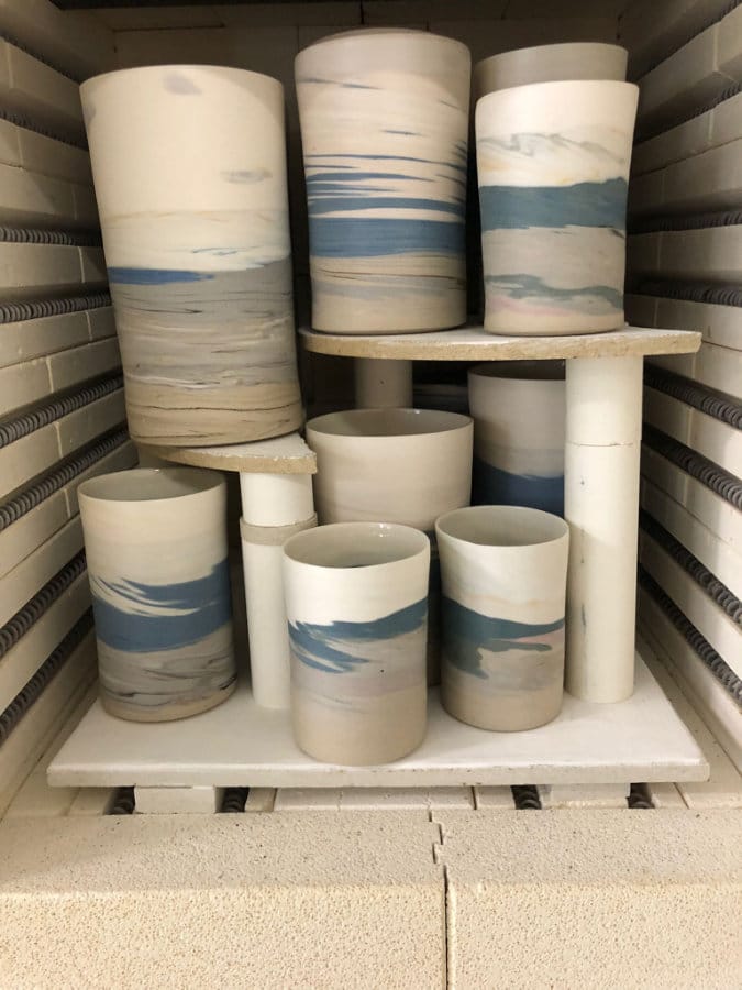 It is a challenge to twist the two materials together. I always compare this to combining peanut butter and cottage cheese. I chose the cylinder as the shape because all deviations and problems become super visible in it, and it is not possible to disguise anything. Multiple layers are centered on top of each other. By guiding the transitions well, by directing the pulling up of the clay in a certain way, the materials are gradually twisted together. Adding color (pigments) to the clay, enables me to create colorful spatial and empty landscapes.