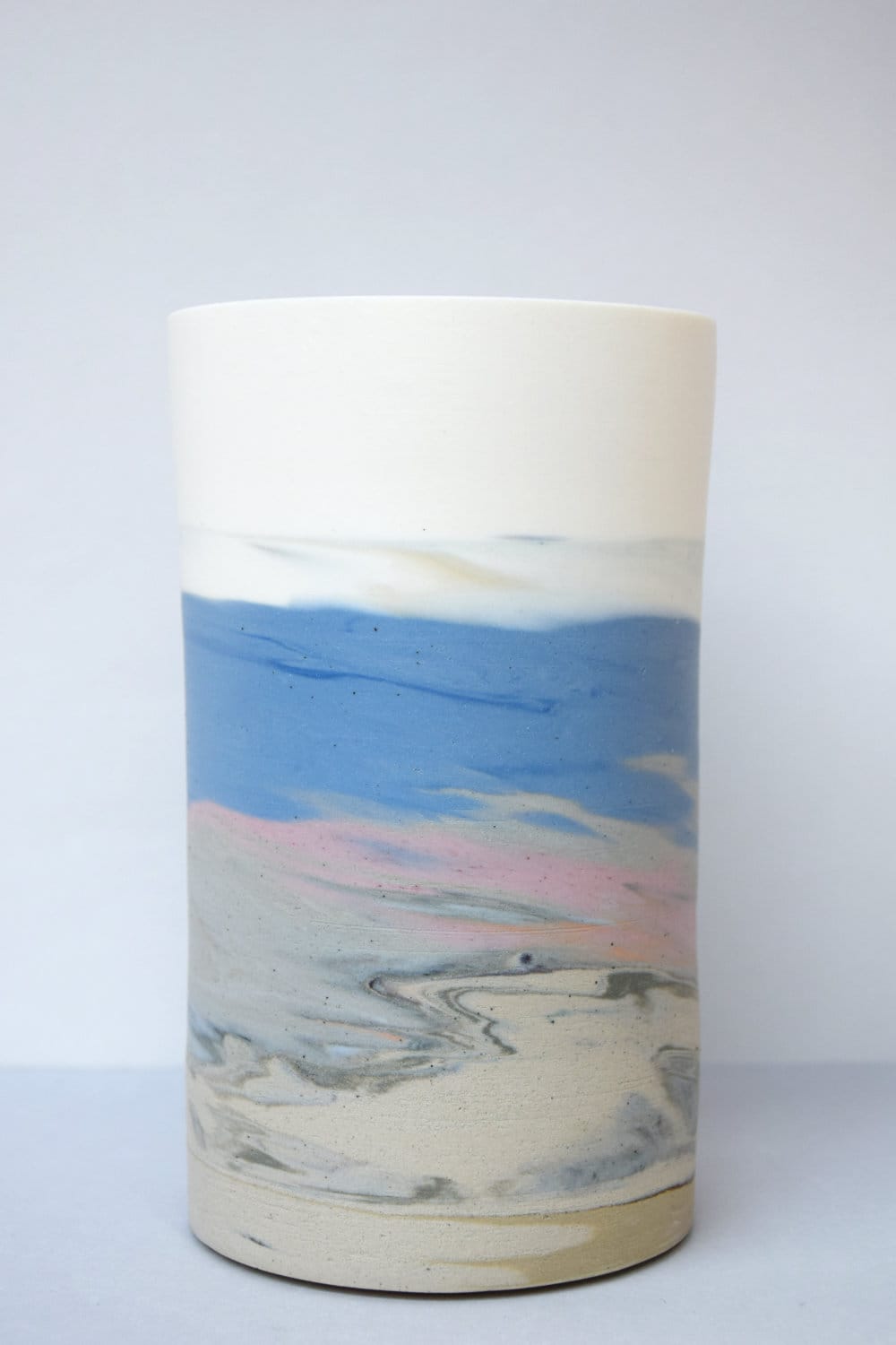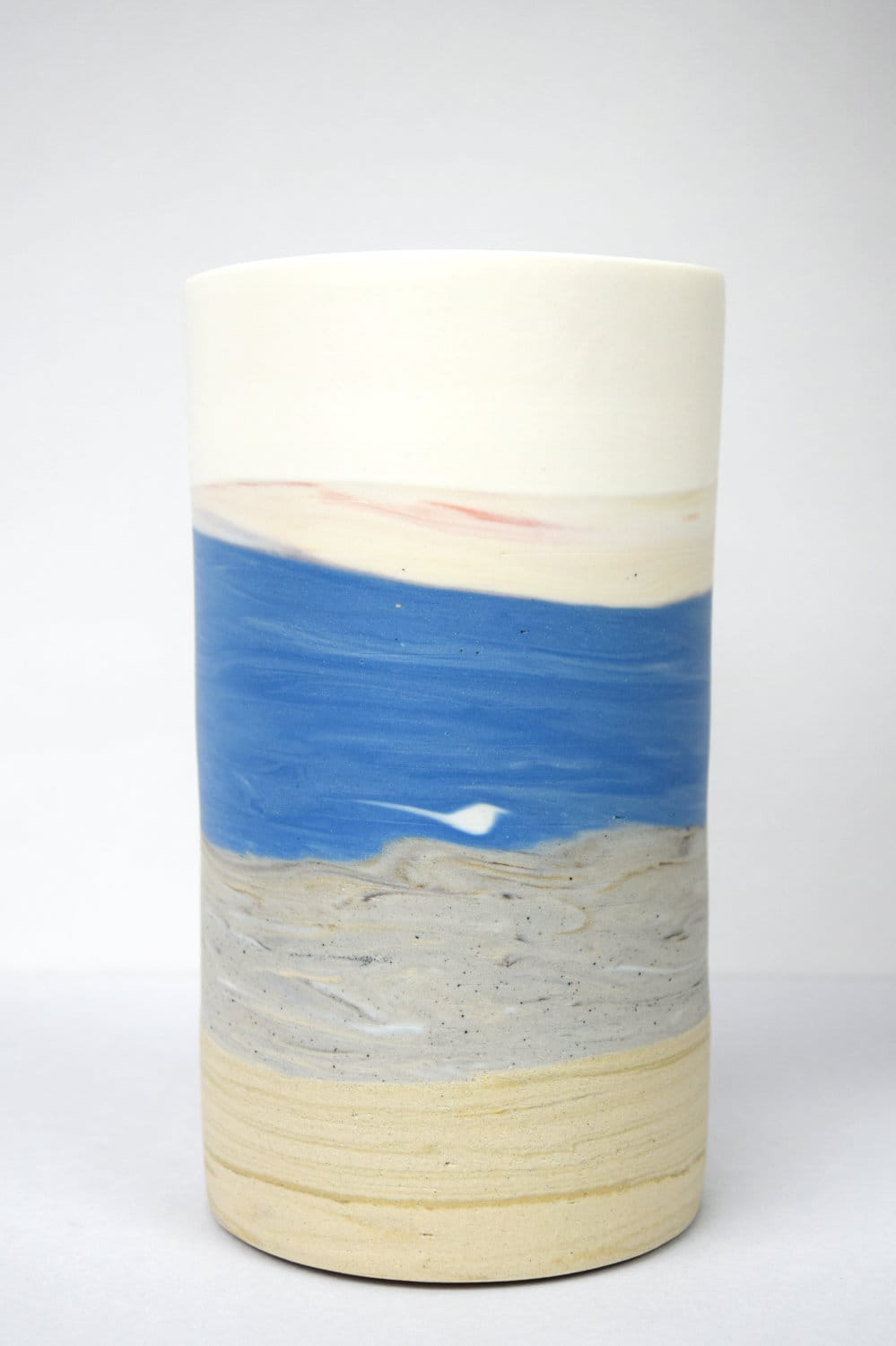 Een selectie uit de serie ‘Zin in Zee’. Deze cilinders zijn gedraaid met in de basis steengoedklei en naar boven toe porseleinklei. De weerbarstigheid, spanning en krimp tijdens het draai- en bakproces blijven zichtbaar door de lichte vervormingen in het werk. Op alle vlakken, zowel het draaien als het stoken, was dit een zoektocht. Door tijdens het draaien te experimenteren met gekleurde klei, ontstonden er schilderachtige landschappen.
